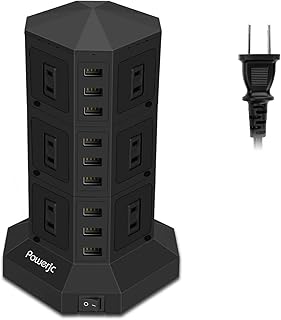 POWERJC タワー式 電源タップ 縦型コンセント AC差込口+USBポート約3M USB急速充電器 スイッチ付 掛ける可能 職場用 2層 ブラック PSE認証済み [並行輸入品]